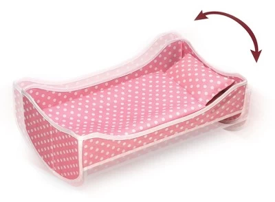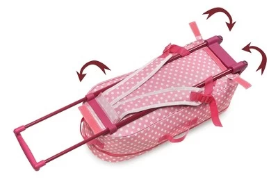 Badger Basket’s 3-in-1 Trolley Doll Carrier with Rocking Bed and Bedding gives you three options for taking your doll anywhere! Pull your doll along, with her clothes and accessories, on the smooth rolling trolley or remove the carrier from the trolley frame and carry your treasured friend using the grab-and-go tote handles on the top and side. If you need your hands free, the carrier also has adjustable, padded backpack straps for transporting your doll in comfort and style on your back! Use the folding, 2-in-1 travel bed in either a rocking or a stationary position. Cardholder on the front for adding a name or address tag (paper card not included). Four, elasticized, mesh pockets inside the carrier help with sorting and organizing your doll’s small and special things, or your sleepover gear. Trolley has a height adjustable pull handle, and two, smooth-rolling wheels. Carrier attaches to the trolley with three hook-and-loop straps and easily removes from the trolley frame to carry separately. Clear, heart-shaped vinyl window on the front so you can see in (or your doll can see out!). Bed assembles simply by unfolding it and inserting the platform panel. Padded backpack straps for your child’s comfort adjust as your child grows. For Dolls up to 18 inches. Fits 18-inch dolls such as American Girl, My Life As, Madame Alexander, and Our Generation; and fits 15-inch American Girl Bitty Baby dolls and 14.5-inch American Girl WellieWishers dolls. Travel Case and Pillow made with 100% Polyester fabric with 100% Polyester filling. Blanket and Bed made with 100% Polyester fabric. Bed has internal cardboard support panels. Trolley frame made with steel metal and recyclable PP plastic. Strap adjustment buckles made with PP plastic. Overall assembled dimensions 9 inches L x 6.5 inches W x 22.5 inches H (30 inches H with handle extended). Travel case: 9 inches L x 5 inches W x 20.5 inches H. Trolley frame: 7 inches L x 6.5 inches W x 22.5 inches H (30 inches H with handle extended). Bed: 19.5 inches L x 11 inches W x 7 inches High (interior of the bed is 19 inches L x 10.5 inches W). Pillow: 8 inches L x 4.5 inches W x 1.5 inches H. Blanket: 18.5 inches L x 14.5 inches W. Length of backpack straps from top to bottom at maximum extension is 24 inches (minimum extension is 15 inches). Padded straps are 2 inches wide. Webbed, adjustment straps are 1 inch wide. Assembled weight: 3 pounds. All measurements approximate and can vary whether the case is empty or filled. Spot clean travel case and travel bed as needed with a damp cloth and mild detergent. Allow to air dry. Do not heavily soak nor immerse the travel case or the travel bed in water. Hand wash pillow and blanket and allow to air dry. Do not store the Travel Case where it is below freezing temperatures because it may cause damage to the clear PVC-vinyl viewing window. Adult assembly required (no tools needed). Illustrated instructions included. For children from three years old and up. This toy is for dolls only and is not for use with real infants or pets. /! WARNING: CHOKING HAZARD – Small parts. Not for children under 3 yrs. Product complies with all currently applicable safety standards. Product includes a limited warranty of 30 Days Parts to the original purchaser. Doll and doll clothes/accessories not included. Product may vary slightly from shown and described. Props/accessories shown are for illustration purposes only and are not included with the product. Actual color/finish may vary slightly from screen display. This item ships in its original carton that may include a product photo.
