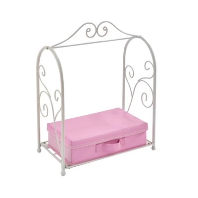 Every doll deserves their very own dress-up center decked out with their fanciest dresses and accessories. Badger Basket’s Scrollwork Metal Doll Armoire creates an imaginative space for girls and dolls alike, so you can organize and display all of your formal attire. To get your collection started, we’ve included two dresses and a leather-like fashion backpack to fit most 18 inch dolls. Store your small accessories inside the handy storage bin with detachable lid and hang your dresses on the three metal hangers. Designed for any brand of 14.5-20 inch dolls such as American Girl, My Life As, Madame Alexander, and Our Generation and 14.5-inch American Girl WellieWishers dolls. Made with metal, 100% polyester fabric, PU leather-like and non-woven fabric. Imported. Overall dimensions: 15 inches L x 8.5 inches W x 18.75 inches H. Storage Bin: 12 inches L x 7.25 inches W x 3.5 inches H. Hangers: 6.5 inches L x 3.25 inches W. Backpack: 3.5 inches L x 2 inches W x 4.5 inches H. White dress: 8.5 inches from shoulder to bottom hem. Pink Dress: 8 inches from top hem to bottom of tulle, ribbon 16 inches L. Assembled weight: 3.3 pounds. All measurements approximate. Adult assembly required. Illustrated instructions included. This item is for use with dolls only. /! WARNING: CHOKING HAZARD – Small parts. Not for children under 3 yrs. Product complies with all currently applicable safety standards. Manufacturer’s 30 day limited warranty to the original purchaser. Product may vary slightly from shown and described. Dolls/accessories shown are for illustration purposes only and are not included with the product. Actual color/finish may vary slightly from screen display. This item ships in its original carton that may include a product photo.