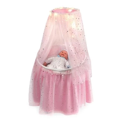 The Badger Basket Sweet Dreams Round Doll Bassinet features a beautifully lit LED canopy of luxurious tulle panels and a double layer bed skirt with shiny metallic stars. Featuring a whimsical design, including soft glow lights, a long flowing canopy, and a cozy padded bed, this doll bassinet is truly fit for a princess. The bed frame sits upon four caster wheels, so the bassinet can easily be moved from place to place. Each bassinet comes with a full string of LED lights and requires 2 AA batteries, not included. Also doubles as a beautiful way to display collectible or Reborn dolls. For dolls up to 18 inches, including American Girl, Bitty Baby, WellieWishers, Our Generation, Madame Alexander and My Life As. Measures 33 inches H x 20 inch diameter. Interior Bed area: 6.5 inches H x 19 inch diameter. Height from floor to bottom of bed: 11 inches. Height from floor to top of bed rail: 17.5 inches. Height from bottom of bed to canopy: 21 inches. Canopy: 10 inch diameter. Tulle canopy panels: 23 inches L. Wipe and spot clean as needed. Assembled weight: 4.4 pounds. All measurements approximate. Adult assembly required. Illustrated instructions included. This item is for use with dolls only and is not for use with real infants or pets. /! WARNING: CHOKING HAZARD – Small parts. Not for children under 3 yrs. Product complies with all currently applicable safety standards. Manufacturer’s 30 day limited warranty to the original purchaser. Product may vary slightly from shown and described. Dolls/accessories shown are for illustration purposes only and are not included with the product. Actual color/finish may vary slightly from screen display. This item ships in its original carton that may include a product photo.