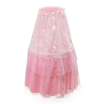 - A doll bed fit for a princess, adorned with a whimsical canopy complete with sparkling lights and delicate mesh fabric