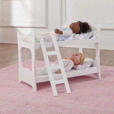 Badger Basket’s White Rose Doll Bunk Bed is perfect for sisters or sleepovers! Two dolls can slumber in comfort thanks to the two padded blankets and eight pillows. For children ages three and up and dolls up to 20 inches. Made with MDF and fabric. Wipe and spot clean as needed. Overall assembled dimensions: 22.25 inches L x 11.25 inches W x 17 inches H. Adult assembly required.