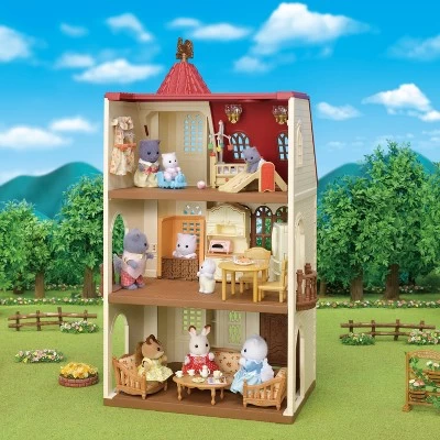 Red Roof Tower Home is a three-story house with a pointed roof and an elevator. It comes with Persian Cat Girl and assorted furniture, so you can play with this set right away. Red Roof Tower Home lets you turn the weather vane to move the elevator up and down. The doors will automatically open and close when it reaches each floor. The Red Roof Tower Home set comes with Persian Cat Girl, a table and chairs. Combine with Red Roof Cozy Cottage, Red Roof Country Home or Sweet Raspberry Home (sold separately) to create a huge house. Or use with other figures and furniture for even more fun (sold separately). Main Unit, Three Floors, Fence x2, Weather Vane, Weather Vane Support Beam, Pointed Roof, Persian Cat Girl, Table, Chair x2 (a total of 11 pieces)