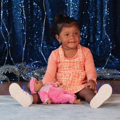 Mon Premier Bebe Calin Maria is the perfect “my first baby doll” for your little one to cuddle. This adorable brown-eyed, 12-inch baby doll has a bean-filled body that allows children to pose her just like a real baby! Dressed in a pink and white romper and a pink headband with hearts, this beautiful doll is ready for all occasions. Features a soft vanilla scent for added delight.