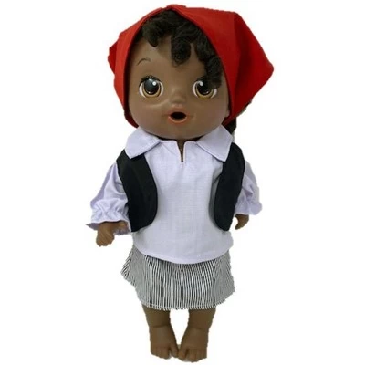 Ahoy all you girls and boys with Baby Alive or little baby dolls.Dress them up in the pirate spirit with this totally authentic looking outfit.Shirt, vest, skirt, bandanna, head scarf and eye patch can all be worn together or mixed and matchedShown on a Baby Alive doll who is 12 inches tall with an 8 inch waist.This listing is for one doll pirate outfit, the doll and shoes are not included.
