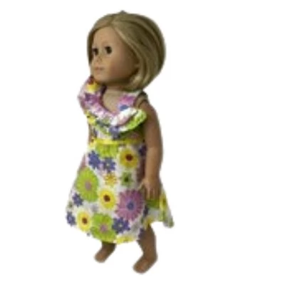 Truly an elegant dress for the fashion minded girl and her 18 inch doll who are looking for something unusual. The material is thin cotton, perfect for a summer day.Size 4 sundress is totally rocking in both design and materialThe material is a cotton blend with pink, yellow, green and purple flowers and among the flowers there are dots of silver glitterDress features a yellow satin ribbon at the waist, and an over the shoulder ruffleWhen laying flat, the dress measures 12 inches from side seam to side seam at the empire waistIt is 29 1/2 inches from the shoulder to the hemlineThe matching doll dress will fit 18 inch girl dolls like American girl, Our Generation, My Life dollsThis listing is for one child and one doll dress, the doll is not included