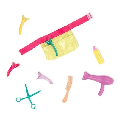 - Styling Accessories: Features a pretend blow dryer, 4 hair clips, a pair of scissors, comb, spray bottle, and a stylist apron to neatly hold her styling tools.