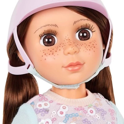 Nora is always ready to have sparkly adventures, and she adores horses. This Glitter Girls 14-inch doll enjoys sunny days and cozy sweaters with a touch of glitter! Nora has long auburn hair, cute freckles, and deep brown eyes framed by long eyelashes. Her arms and legs are poseable, bending at the elbows and knees so you can change her style for any occasion! She’s ready to make friends and shine bright! Glitter Girls dolls each come with one complete outfit. Nora comes wearing her favorite riding outfit: knit leggings with a heart-patterned skirt, a two-toned sweater, a lilac helmet, and sparkling riding boots with pale pink accents.