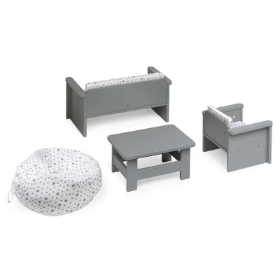 Badger Basket’s Living Room Furniture Set for 18 inch Dolls has ample, padded seating and generous table space for gatherings with several doll friends and plush pets. Includes a long couch, wide chair, spacious table, and squishable beanbag. For children ages three and up and dolls up to 18 inches. Made with wood, MDF, and fabric. Wipe and spot clean as needed. Overall assembled dimensions of the couch: 16.25 inches L x 8 inches W x 7.5 inches H. Adult assembly required.