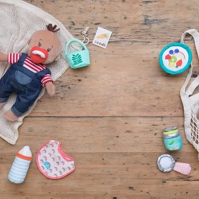Kids learn a lot through imaginative play, and your little one will love the nurturing aspect of feeding their baby dolls with our Stella Collection Baby Doll Feeding Set for 12″ and 15″ dolls. Durably constructed with surface washable fabrics, the pretend 5-piece food and bottle set includes an adjustable fabric bib, pretend can of organic peas with moving lid, soft bowl showing a variety of silkscreened fruits, soft spoon and 4.5″ magnetic baby bottle; bottle will only magnetize to 12″ Wee Baby Stella doll mouths. Wee Baby Stella and Baby Stella dolls by Manhattan Toy, are ideal first baby dolls that will encourage little ones to role play, nurture and care. The Stella dolls are sold separately but are completely soft and beautifully crafted with lifelike details such as a belly button and perfectly plump tummy. You can change their outfits and every doll comes with a magnetic pacifier. Since 1978, Manhattan Toy has been making award-winning, high quality, educational toys for your baby, toddler or kid. From incredibly soft plush toys to baby dolls and doll accessories, our goal is to provide the safest and best toys available..
