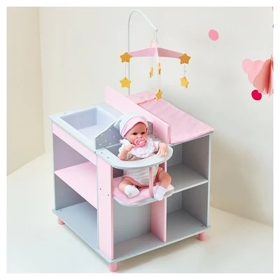Does your doll need a special place to be changed? Bring home a special changing table for her today! The gray with white polka dotted, pink colored blocked changing table we offer has a charming baby pink mobile with yellow stars. A baby pink pad for baby to lay on make a super cozy place for them to nap, storage space below with a set of pink hangers make storage easy, and on the opposite side, there is a sink to wash baby off and a storage area below with gray shelf. Baby doll can also be seated on the side of the unit while you get everything set up for him or her.