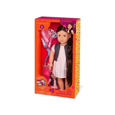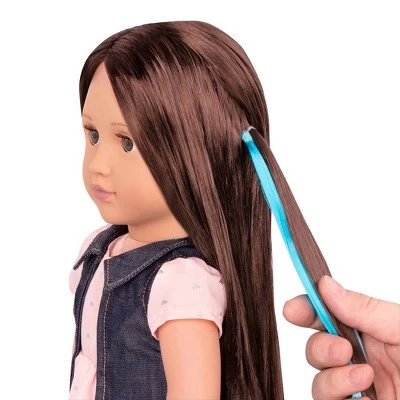 From brilliant blue streaks to beautiful brunette locks, your hairstyle skills will grow to new lengths with Kaelyn, a beautiful 18-inch Our Generation Hair Play Doll. With her warm brown eyes and her ultra-long, beautifully silky rich brunette hair, it’s easy to get creative with Kaelyn! OG Hair Play Dolls have long, extendable braids that can be made longer or shorter with the push of a button (but please don’t untie them!) Use the hair clips, hair extensions, and accessories to create an endless array of new hairstyles that you can practice on yourself, too! Use the included hair style guide for inspiration, or invent your very own amazing styles. With Hair Play dolls like Kaelyn, your imagination is all you need.