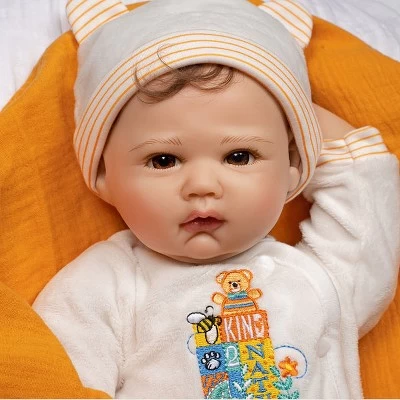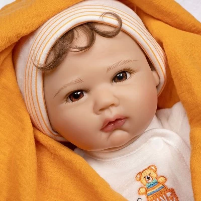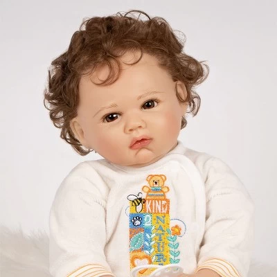 Spring into nature fun with Nature Lover! Dressed in a luxuriously soft cream footed sleeper with an embroidered message that says, Be Kind 2 Nature and a matching, striped cap with bear ears, a day of outdoor exploration with this gender- the neutral baby doll will surely leave you refreshed and inspired. Nature Lover has soft, wispy brown curls poking out its baby cap. This little darlings hair perfectly frames its charming brown eyes, rosy plump cheeks, and baby lips. Look at those cute folds on its baby chin… so tempting to kiss! This baby also comes with a white magnetic pacifier and a mango-colored muslin swaddling blanket for the best sleep ever. Nature Lover is a 19-inch realistic gender-neutral baby doll sculpted with love by world-renowned artist Michelle Fagan. This lifelike oddler is crafted from our premium SoftTouch Vinyl which gives it a delicious baby powder scent and a realistic feel. With this vinyl, Nature Lover has incredibly realistic features including baby creases and rolls! Arriving to you in our new eco-friendly Collectors ox and a numbered Certificate of Authenticity with the artists signature. Intended for reborn doll collectors aged 3+. Browse our collection of reborn doll accessories, including our popular Reborn Doll Diapers and customer-favorite Baby Doll Magic Bottles! Our doll accessories are perfect for bonding with your baby doll or completing your Paradise Galleries gift.