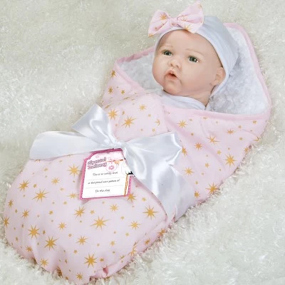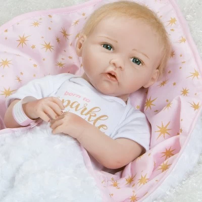 Born to Sparkle is ready to be center stage and in the spotlight! This towhead sparkles with delicate features and bright blue eyes.Her head, arms, and legs are made of the innovative silicone-like FlexTouch vinyl which feels wonderfully soft and so lifelike, just like a real reborn baby girl! Her body is cloth and weighted for that real baby feel. Youll love running your fingers through this little girls head of light blonde hand-applied faux mohair while staring into her bright handset eyes with hand applied eyelashes. This realistic baby girl doll also features hand-painted fingernails, toenails, and lips. She is bundled up tight in a pink receiving blanket with gold star design, and a white faux fur lining.Born to Sparkle is printed on her white cotton onesie and captures her vibrant personality perfectly. She arrives with a Special Delivery gift tag, authentic hospital bracelet, birth certificate, and even a real diaper!Born to Sparkle by Jannie de Lange is part of Paradise Galleries precious Baby Bundles collection, a group of 7 ultra-realistic baby dolls that look like true newborn baby dolls. Each Baby Bundle is handcrafted in unbelievably lifelike silicone-like FlexTouch vinyl, featuring faux mohair and hand-painted details. This FlexTouch vinyl technology makes her feel just like a silicone baby doll. Every newborn bundle is outfitted in a white cotton onesie with themed saying printed on the chest, and a cute cap. These new arrivals also come with a cozy, cushiony soft receiving blanket tied up with a bow, gift tag, a customizable hospital bracelet, birth certificate, and diaper. All Baby Bundles also come in a Collectors Box and a signed Certificate of Authenticity with the artists signature.Browse our collection of reborn doll accessories, including our popular Reborn Doll Diapers and customer-favorite Baby Doll Magic Bottles! Our doll accessories are perfect for bonding with your realistic baby doll or completing your Paradise Galleries gift set.
