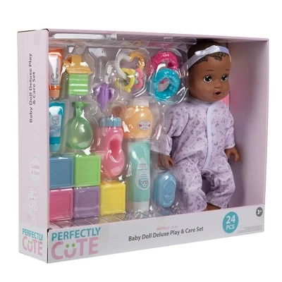 This amazing 24-piece deluxe set contains an adorably cute doll dressed in pajamas, headband and a removable diaper. Set also includes everything you need for hours of fun pretend play including blocks, a teether toy and teething ring for play time; Diaper cream, lotion jar and hand sanitizer for changing time; Bottle for feeding time; soap dispenser, bar of soap and wash cloth for pretend bath play; and toothbrush, toothpaste, box of tissues and pacifier for bed time.