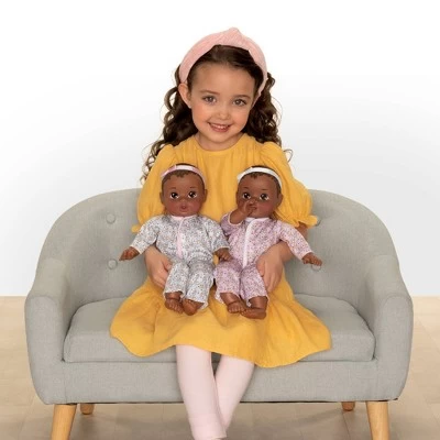 Your little one will adore doubling baby doll fun time with their very own set of Perfectly Cute 14” My Sweet Baby Doll identical TWINS! Dolls comes delightfully dressed in matching bumble bee printed onesies in pink and in white. Each My Sweet Baby twin features a soft’n’cuddly body with easy-to-wipe-clean, durable hard plastic arms, legs, & head. Coordinating pacifiers, milk bottles, pacifier clips & satin ribbon headbands also included! They’re the identically sweet addition to every baby doll collection!
