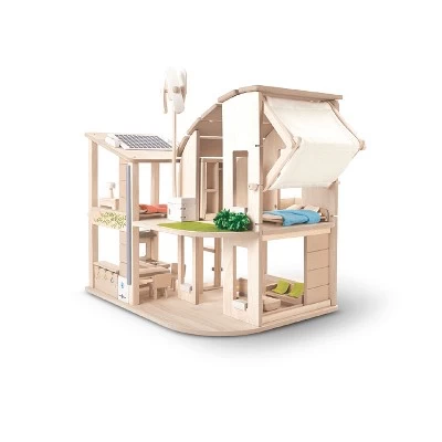 The PlanToys Green Dollhouse with Furniture has an energy efficient design includes a wind turbine, a solar cell panel, electric inverter, recycling bins, a rain barrel, a biofacade, and a blind that can adjust the amount of sunlight and air circulation.