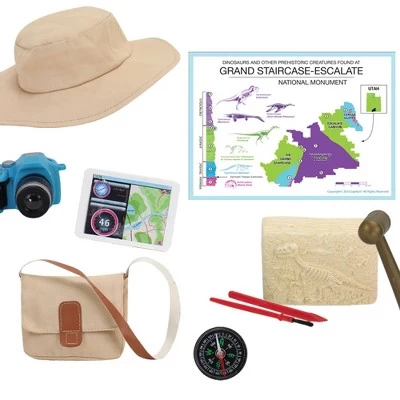 - INCLUDED: 10 total pieces include a khaki hat, satchel bag, tablet with GPS, compass, dinosaur map, camera, dig block with surprise, mallet, pick and brush sized for 18 inch dolls.