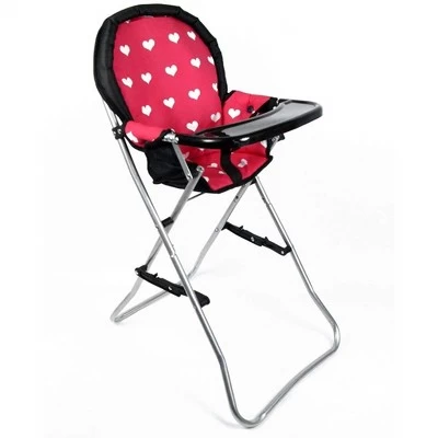 Great for encouraging imaginative playtime. Your child will learn to feed, nurture and give with love. Added fun with our adorable pink heart design. Complete the look with our matching heart design strollers, pack-n-play, and bouncer. The highchair opens and folds very easily. With its fold-flat feature, it will take up minimal storage space when not in use. Also, great to take along when traveling. This highchair is portable and lightweight, the perfect play addition for little girls and boys. Made with high-quality fabrics and materials, this doll highchair was designed to last. This item is 100% safe for little kids and pets and passed all required safety tests.