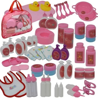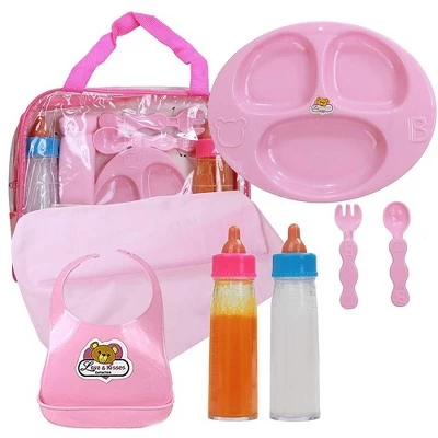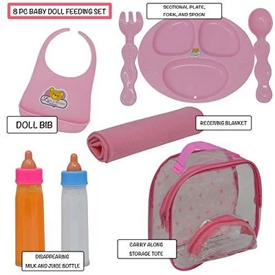 Young caregivers will love this complete set of Baby Doll Accessories to “parent” their first baby dolls! Children can attach the Doll bib and feed their babies with bottles, spoon, spork, divided dish, Use the Doll Pampers to clean up your doll and when ready use the Doll Training Potty to toilet train your doll. A Doll Pacifier and other Baby Doll Accessories are also included. When finished playing kids can easily store all pieces in the provide easy zip close storage bag. This complete doll care set makes it easy to keep a pretend nursery well-stocked and organized, while promoting language, imaginative and pretend play, and encouraging young kids to develop nurturing skills.
